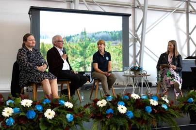 Kuva: Paneelikeskustelussa Krista Kiuru, Kai Merivuori ja Liisa-Maija Perävainio keskustelivat sahateollisuuden ja metsätalouden tulevaisuuden näkymistä (kuvaaja: Esa Kyyrö)